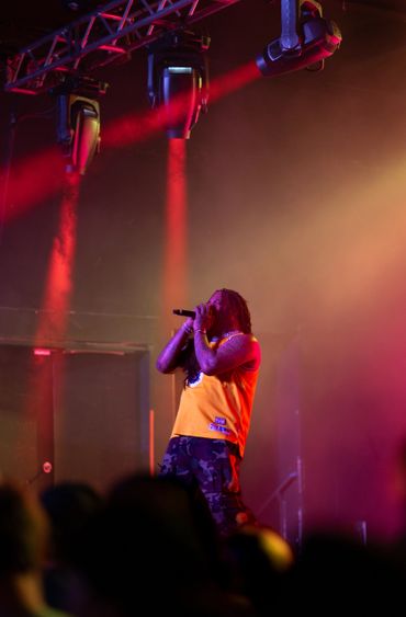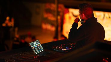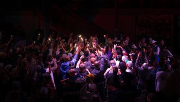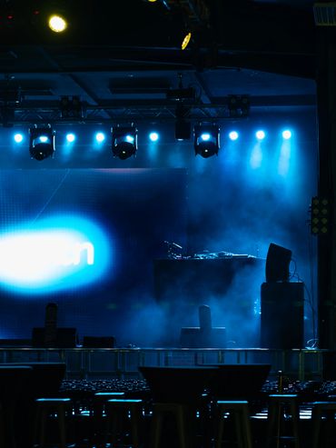 Dimly lit stage with guitars, drums, and amplifiers ready for a live music performance.