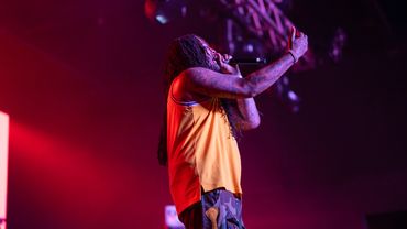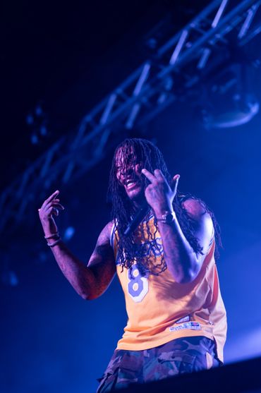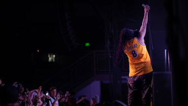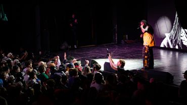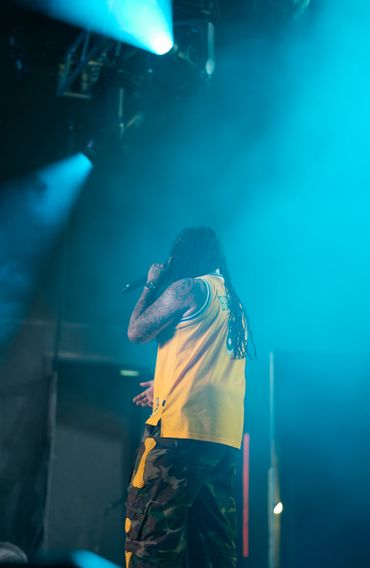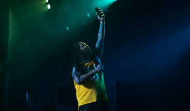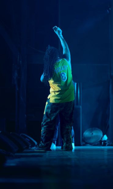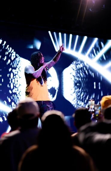 Musician performing on stage with blue lighting and audience watching.