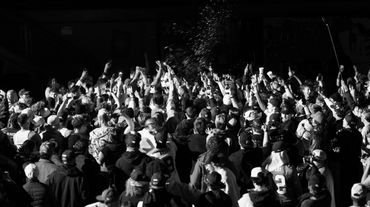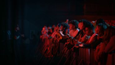 Two musicians adjust guitars on stage while the audience watches and applauds.