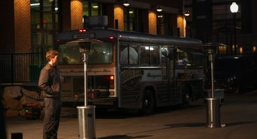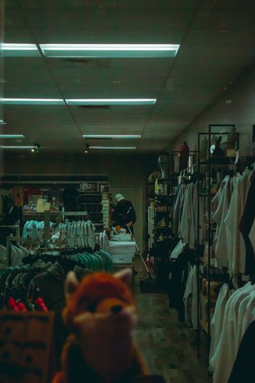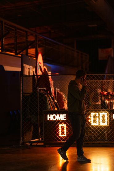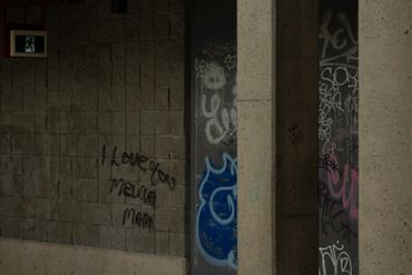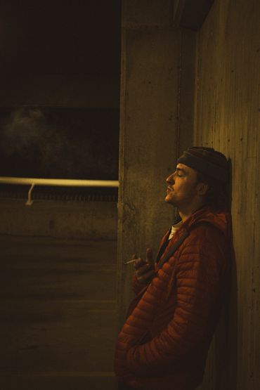 A person stands alone in a dimly lit corridor with stairs ahead.