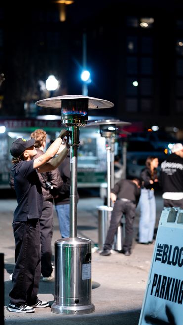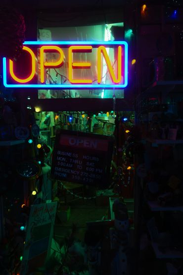 Ferris wheel ride at night with a 'We are OPEN' sign and yellow fence.