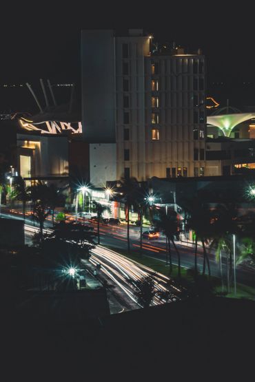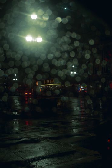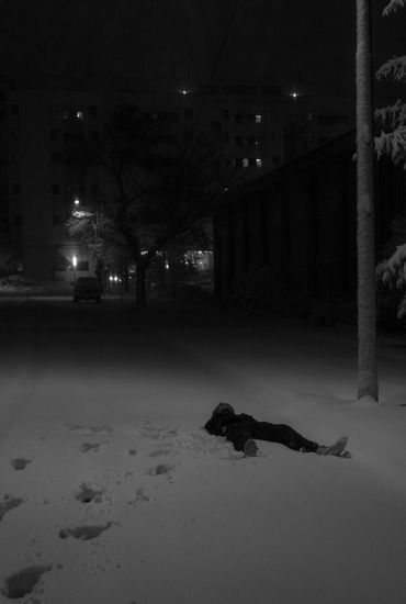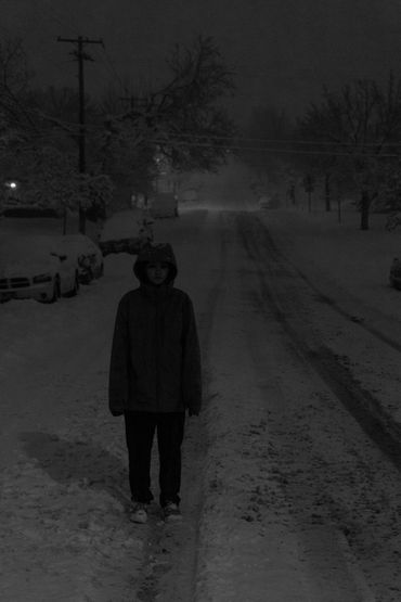 A person stands on dark stairs beneath leafless trees and glowing street lamps at night.